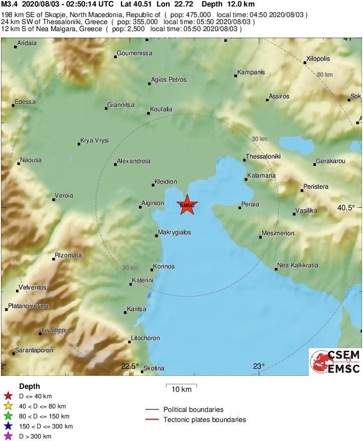 H αυτόματη λύση του Γεωδυναμικού Ινστιτούτου του Αστεροσκοπείου Αθηνών δίνει το σεισμό στα 3,3 Ρίχτερ, με εστιακό βάθος τα 10 χλμ., και επίκεντρο τα 19 χλμ. δυτικά-νοτιοδυτικά της Θεσσαλονίκης.