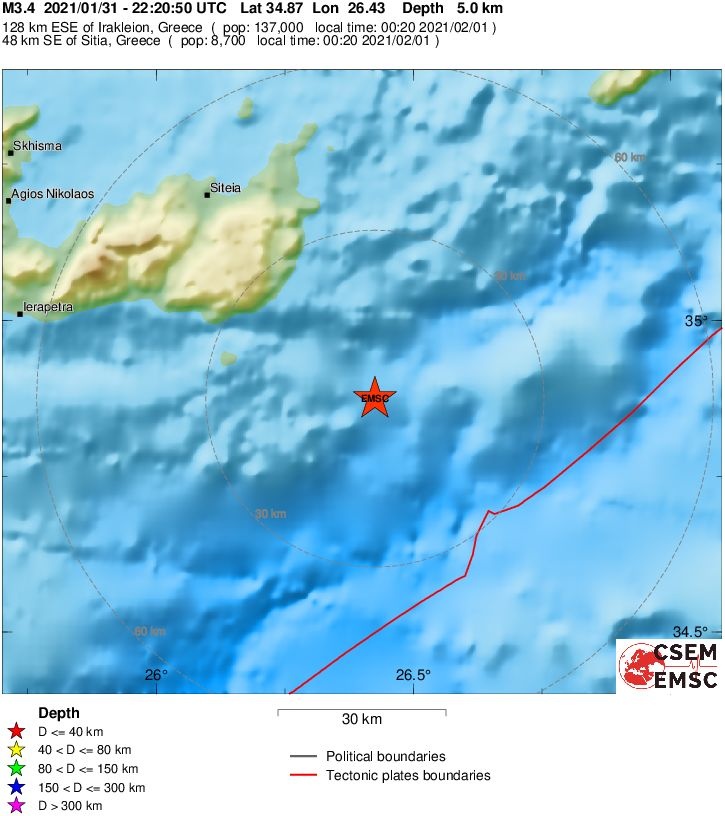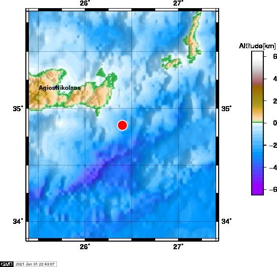Το ακριβές επίκεντρο τη δόνησης εντοπίζεται στα 48 χλμ. νότια-νοτιοανατολικά της Σητείας.
