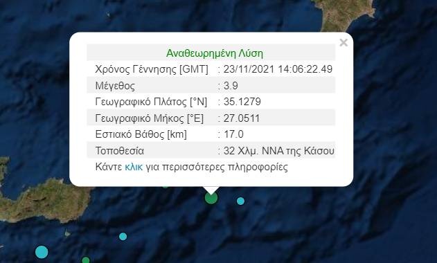 Σεισμική δόνηση σημειώθηκε στις 16:06 το απόγευμα της Τρίτης (23/11) κοντά στο νησί της Κάσου.