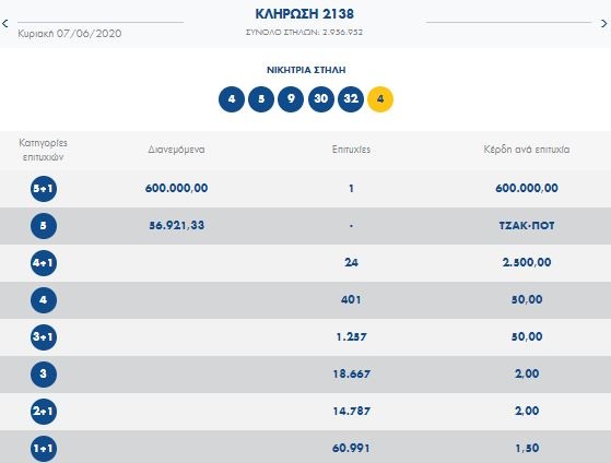 Οι τυχεροί αριθμοί που ανέδειξε η κληρωτίδα της χθεσινής κλήρωσης είναι οι: 4, 5, 9, 30, 32 και Τζόκερ ο αριθμός 4.