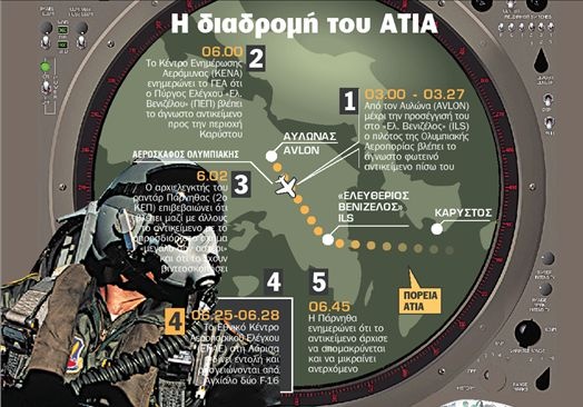 Η αναφορά σήμανε συναγερμό στην Πολιτική Αεροπορία, η οποία με τη σειρά της ειδοποίησε- βάσει των κανονισμών- το Κέντρο Ενημέρωσης Αεράμυνας (ΚΕΝΑ) στην Αθήνα και το Εθνικό Κέντρο Αεροπορικού Ελέγχου (ΕΚΑΕ) στη Λάρισα. Στις 04.20 ειδοποιείται και το Κέντρο Επιχειρήσεων του ΓΕΑ, από τις καταγραφές του οποίου προέρχονται οι πληροφορίες που δημοσιεύουμε.