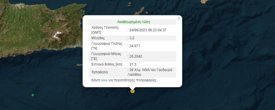 Το επίκεντρο του σεισμού εντοπίστηκε 39 χιλιόμετρα νότια νοτιοανατολικά του Λασιθίου, ενώ το εστιακό του βάθος στα 31,3 χιλιόμετρα.