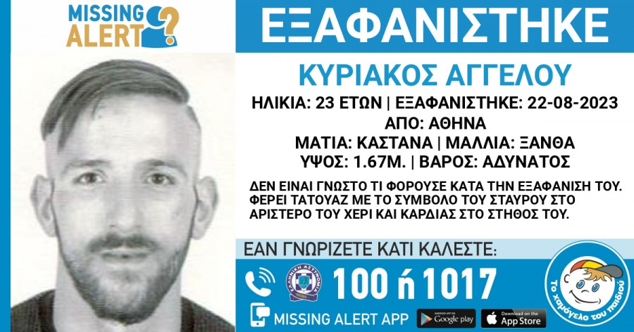 Στις 22 Αυγούστου 2023, στις 21:00, εξαφανίστηκε από την περιοχή της Αθήνας ο Κυριάκος Αγγέλου, 23 ετών.