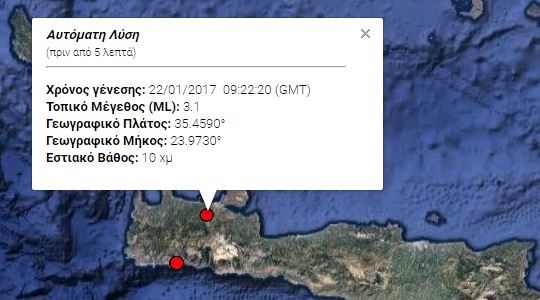 Σεισμική δόνηση μεγέθους 3,1 Ρίχτερ σημειώθηκε στις 11:25 στα Χανιά της Κρήτης.