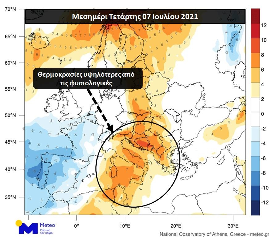 Στον σχετικό χάρτη παρουσιάζεται η απόκλιση της θερμοκρασίας σε ύψος 1500 μέτρων πάνω από το έδαφος, το μεσημέρι της Τετάρτης 07/07.