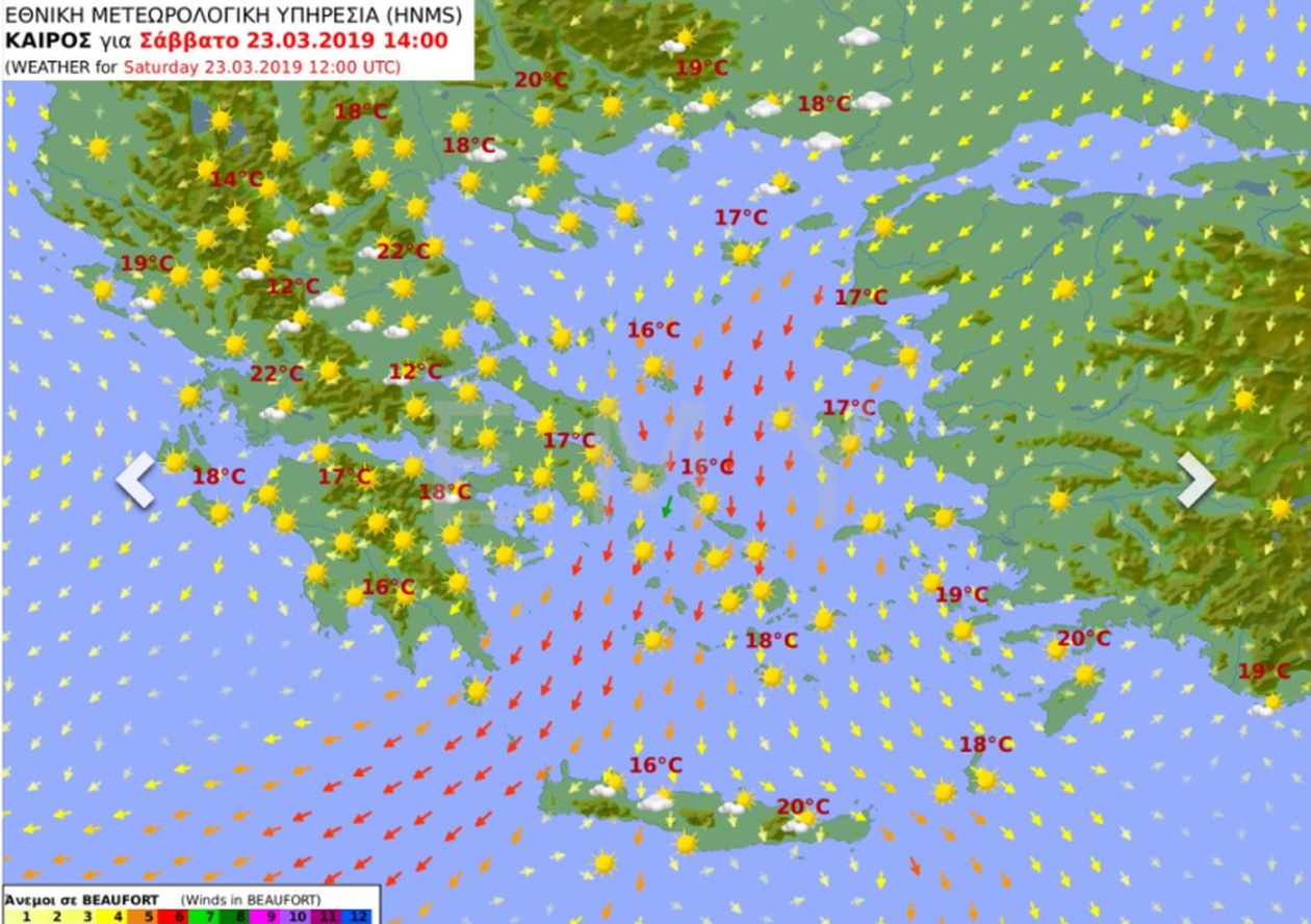 Άνεμοι: βόρειοι βορειοανατολικοί 6 με 7 και τη νύχτα τοπικά 8 μποφόρ.