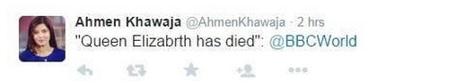 Ένα tweet ήταν αρκετό για να προκληθεί σάλος στην Βρετανία. Συγκεκριμένα, η ρεπόρτερ του BBC Ahmen Khawaja τουίταρε σήμερα το πρωί το «θάνατο» της βασίλισσας Ελισάβετ, με αποτέλεσμα να ξεκινήσει μια παραφιλολογία.