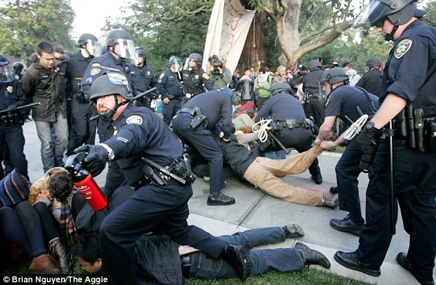 Ενώ οι φοιτητές πραγματοποιούν καθιστική διαμαρτυρία χωρίς να προκαλούν και να ενοχλούν τον αστυνομικό, αυτός τους ψεκάζει με ένα σπρέι πιπεριού.