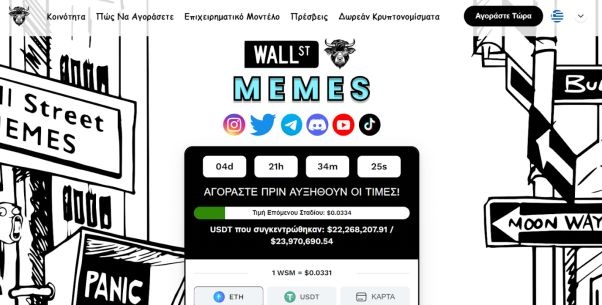 To Wall Street Memes ($WSM) αποτελεί ένα κρυπτονόμισμα το οποίο εκτιμάται ότι θα εκτοξευτεί το προσεχές διάστημα. Άλλωστε, η προπώλησή του έχει ήδη ξεπεράσει τα 22 εκατομμύρια δολάρια, κάτι που το καθιστά το δημοφιλέστερο meme coin για τον Αύγουστο του 2023.