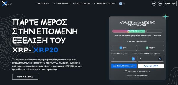Αναζωπυρώνοντας την κοινότητα του XRP, το XRP20 έρχεται για να φέρει τεράστια χρησιμότητα χάρη στο μηχανισμό stake-to-earn. Πλέον, έχετε τη δυνατότητα να αγοράσετε την αναβαθμισμένη έκδοση του XRP σε τιμή που σίγουρα δεν θα μπορέσετε να αντισταθείτε. Συγκεκριμένα, στα 0.000092 δολάρια. Οι εκτιμήσεις των αναλυτών ήδη προβλέπουν ότι το XRP μπορεί να ακολουθήσει μια ξέφρενη πορεία.