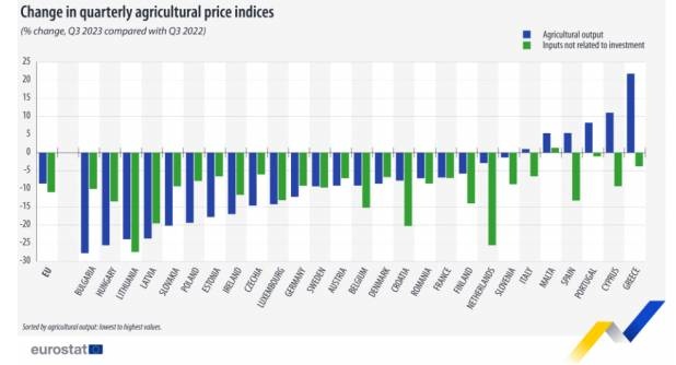 Σύμφωνα με στοιχεία της Eurostat, οι τιμές στο χωράφι μειώθηκαν το γ’ τρίμηνο του 2023 στην Ευρωπαϊκή Ένωση κατά μέσο όρο κατά 9% σε ετήσια βάση, μετά τη σταδιακή αποκλιμάκωση των αυξήσεων τους μετά το γ΄ τρίμηνο του 2022, όταν αυτές είχαν κορυφωθεί (ετήσιος ρυθμός 30%).
