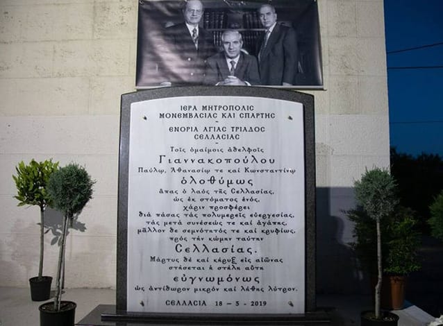«Το καλό που κάνουμε, να το γράφουμε στην άμμο για να σβήνει. Αυτοί που το δέχονται, να το γράφουν στο μάρμαρο για να μη σβήνει ποτέ». Με οδηγό τη λαϊκή ρήση, οι κάτοικοι της Σελλασίας τίμησαν τους συντοπίτες τους με την ανέγερση μαρμάρινης στήλης προς τιμήν των αδελφών Παύλου, Θανάση και Κώστα Γιαννακόπουλου, στο προαύλιο του Ιερού Ναού του χωριού, της Αγίας Τριάδας.