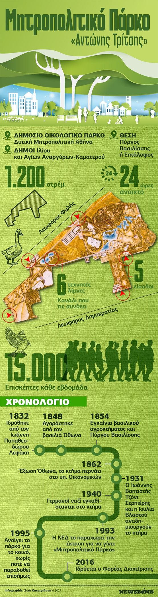 Ένα πάρκο με δέντρα, λίμνες, βλάστηση, νερά, λουλούδια και πουλιά, μια όαση ανάμεσα από το Ίλιον, τους Αγίους Αναργύρους και το Καματερό. Ένας τεράστιος χώρος πρασίνου, όχι μόνο για την Αττική, αλλά και για τα ευρωπαϊκά δεδομένα, στην καρδιά του Δυτικού Τομέα, της πιο «αδικημένης» περιοχής της πρωτεύουσας, κατά γενική ομολογία.
