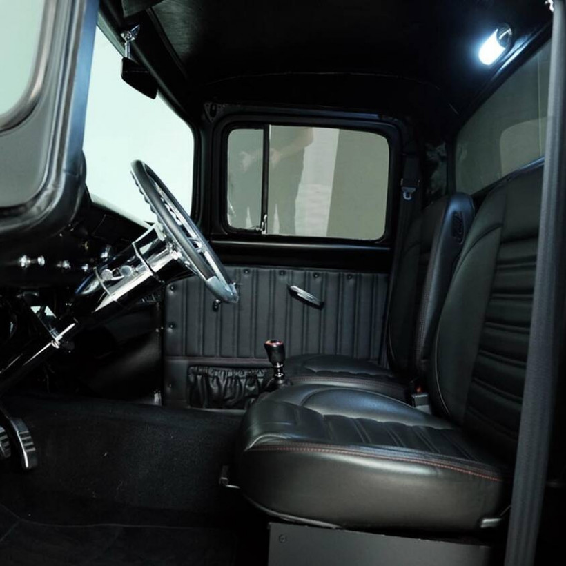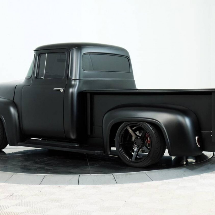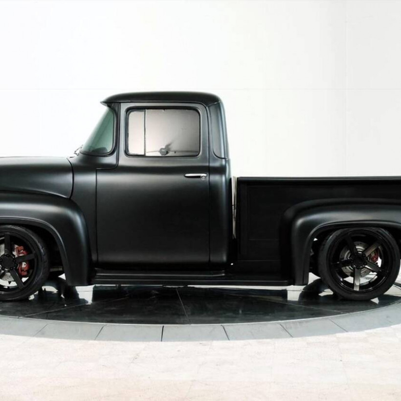 Από τις φωτογραφίες και μόνο αυτό το Ford F-100 του 1956 φαίνεται πως είναι κάτι ιδιαίτερο. Καταρχήν η μαύρη ματ βαφή τονίζει με έναν ιδιαίτερο τρόπο το ρετρό σχήμα που μας παραπέμπει σε ταινίες του Χόλυγουντ εκείνης της εποχής.