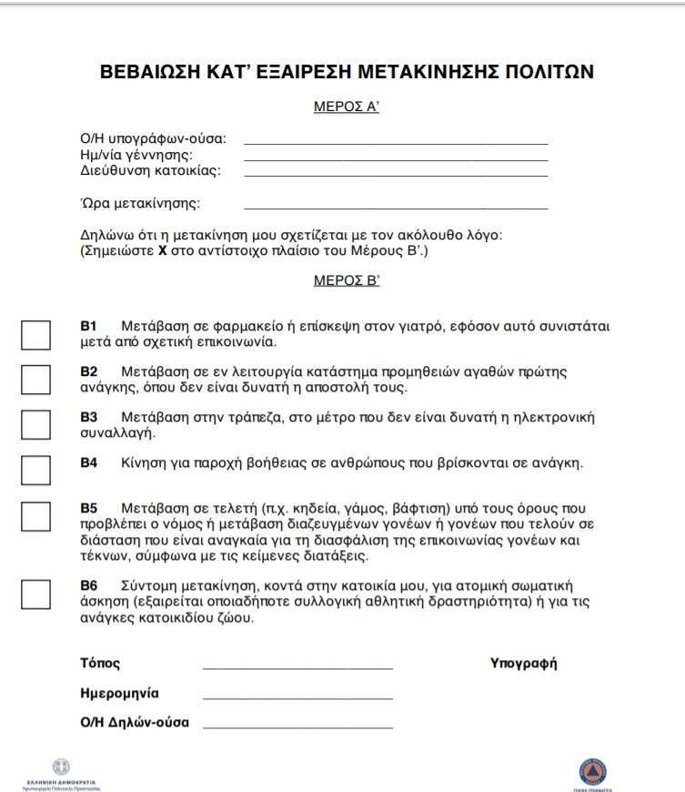 - είτε γράφει χειρόγραφα μια δήλωση με Όνομα/ Επίθετο, Διεύθυνση κατοικίας, ως λόγο τη μετάβαση σε εν λειτουργία συνεργείο με τη διεύθυνσή του, συμπληρώνει ημερομηνία, ώρα και βάζει υπογραφή