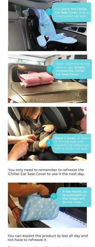 Στην επίσημη ιστοσελίδα της start up εταιρείας που το έχει εμπνευσθεί (για να τη βρείτε αρκεί να googlάρετε τις λέξεις Chiller Car Seat Cover) αναφέρεται πως το κάλυμμα χρειάζεται μερικά μόλις λεπτά για να δροσίσει το κάθισμα. Όταν μάλιστα αυτό γίνει μπορείτε να το τυλίξετε ξανά ή να το απλώσετε σε ένα άλλο κάθισμα του αυτοκινήτου σας. Επίσης το όλο πακέτο μπορεί να διατηρήσει την ικανότητα παροχής δροσιάς για μέχρι και πέντε ώρες. Μετά θα χρειαστεί να μπει και πάλι στο ψυγείο.