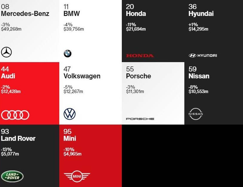 Για πρώτη φορά στην λίστα εμφανίστηκε η Tesla που άφησε πίσω της την Ford (-12%), την Audi (-2%), την Volkswagen (-5%), την Porsche (-3%), τη Nissan (-8%), τη Ferrari (-1%), τη Kia (-9%), τη Land Rover (-13%) και τη Mini (-10%). Για τις υπόλοιπες αυτοκινητοβιομηχανίες δεν υπάρχει αναφορά μιας και βρίσκονται εκτός της λίστας με τις 100 πιο μεγάλες εταιρείες.