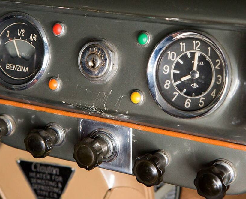 Όπως μπορείτε να δείτε το χρώμα είναι το αυθεντικό και μπορείτε να δείτε πάνω του τη φθορά του χρόνου. Αξιοσημείωτη είναι και η σκουριά πάνω στους τροχούς ή στους προφυλακτήρες, ενώ σε εξαιρετική κατάσταση δείχνει το εσωτερικό με το πορτοκαλί δέρμα και το μεγάλο ξύλινο τιμόνι.