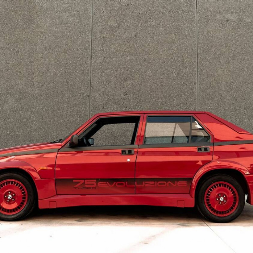 Μία από τις πιο σπάνιες και σχετικά σύγχρονες Alfa Romeo είναι η 75 Turbo Evoluzione. Πρόκειται για μια πολύ ειδική έκδοση που κατασκευάστηκε το 1987 σε μόλις 500 μονάδες και αυτό προκειμένου να δοθεί η απαραίτητη πιστοποίηση, η γνωστή ομολογκασιόν, για την αγωνιστική 75 του Group A. Το συγκεκριμένο αυτοκίνητο είναι βαμμένο σε ένα χαρακτηριστικό γυαλιστερό κόκκινο χρώμα και έχει σχεδόν τα πάντα αυθεντικά. Όπως μπορείτε να δείτε στο ίδιο χρώμα είναι βαμμένες και οι ζάντες, ενώ υπάρχουν και δύο επιγραφές που διατρέχουν τα πλαϊνά του αμαξώματος. Ο προφυλακτήρας με τις εισαγωγές αέρα τονίζει τον αγωνιστικό προσανατολισμό αυτής της ειδικής έκδοσης, ενώ υπάρχουν και διάφορα αεροδυναμικά βοηθήματα. Το εσωτερικό βρίσκεται σε άψογη κατάσταση λες και η 75 βγήκε χτες από τη γραμμή παραγωγής και αυτό παρόλο που έχει διανύσει σχεδόν 74.000 χιλιόμετρα.