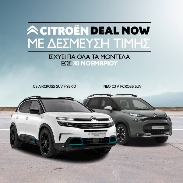 Η Citroën Hellas αντιλαμβανόμενη τις ιδιαίτερες συνθήκες που επικρατούν στην αγορά αυτοκινήτου, με το πρόγραμμα “CITROËN DEAL NOW”, δίνει τη δυνατότητα στους πελάτες της Μάρκας που προβαίνουν σε παραγγελία να “δεσμεύσουν” τη λιανική τιμή αγοράς.
