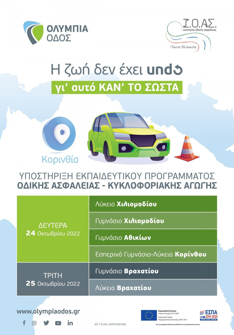Ο δρόμος δεν είναι από μόνος του αρκετός για να μηδενίσει τα ατυχήματα. Καίριο ρόλο έχει ο ανθρώπινος παράγοντας. Γι’αυτό η Ολυμπία Οδός συνεργάζεται με το Ινστιτούτο Οδικής Ασφάλειας «Παύλος Μυλωνάς» για την υλοποίηση του προγράμματος Οδικής Ασφάλειας “Η ζωή δεν έχει Undo”.