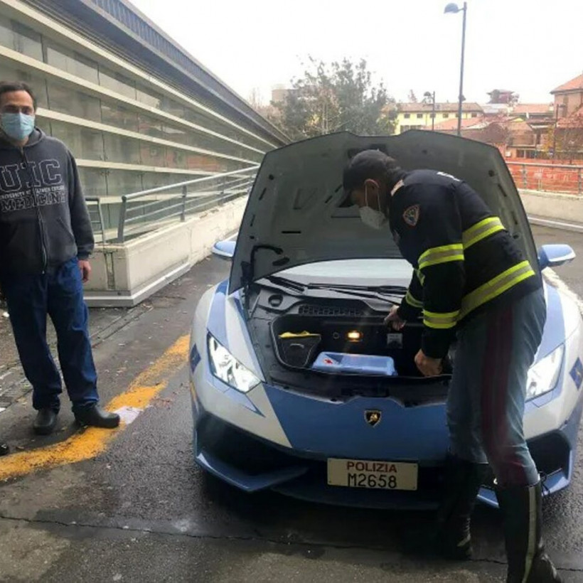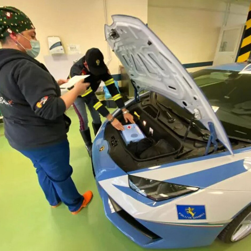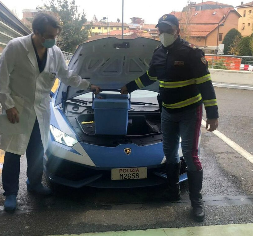 Στις φωτογραφίες μπορείτε να δείτε έναν αστυνομικό να βοηθά τη νοσηλεύτρια στην τοποθέτηση του ειδικού ψυγείου στο πορτμπαγκάζ της Huracan που βρίσκεται μπροστά. Λογικό, καθώς ο V10 των 600 ίππων βρίσκεται πίσω από τις πλάτες οδηγού και συνοδηγού.