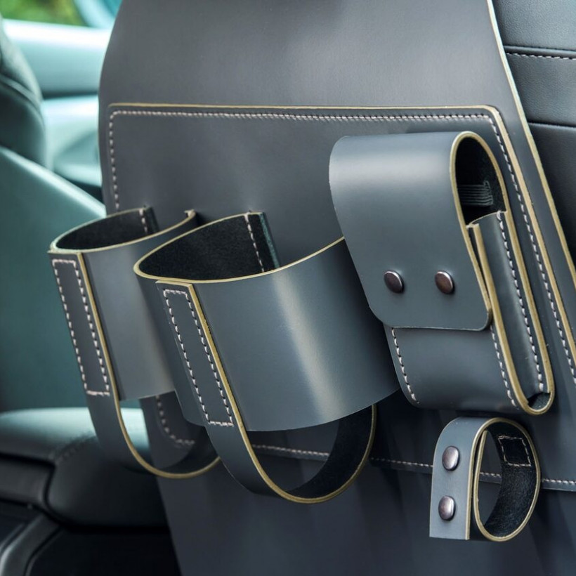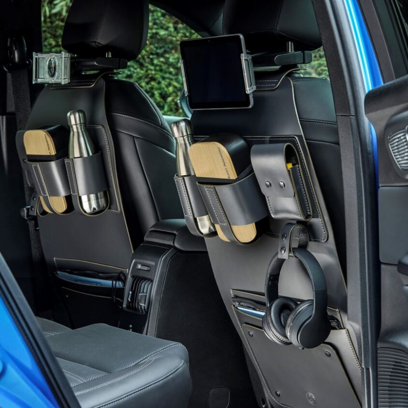 Όσο για τα καθίσματα υπάρχουν ειδικές «ποδιές» που μπαίνουν στις πλάτες των εμπρός και έχουν θήκες για χρήσιμα αξεσουάρ, όπως είναι για ένα μπιμπερό ή θερμός, για ακουστικά, για μία οθόνη, για ένα κουτάκι με μαρκαδόρους, στυλό κ.α.