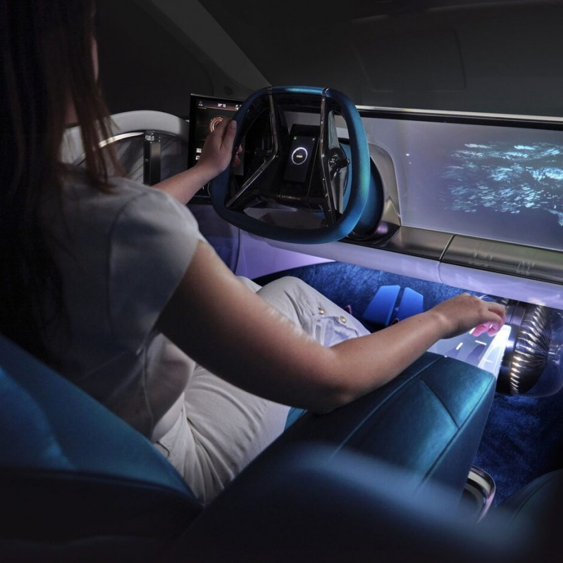 Όπως μπορείτε να δείτε σχεδόν όλο το ταμπλό το καταλαμβάνει ένα πάνελ από οθόνες με τους περισσότερους απτικούς διακόπτες να είναι τοποθετημένοι στα κυρτά άκρα. Ενδιαφέρον παρουσιάζει η δυνατότητα της οθόνης να μετατρέπεται από αδιαφανής σε διαφανή.