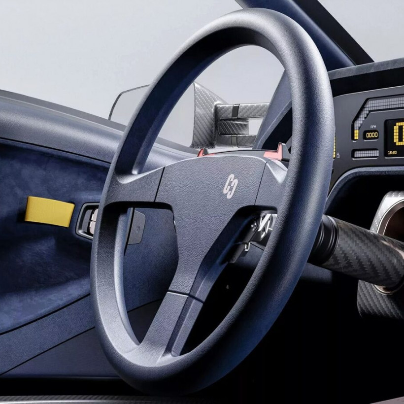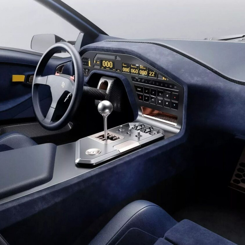 Η καμπίνα είναι επενδυμένη με αλκαντάρα και ότι πιο ακριβό υπάρχει και το ταμπλό συνδυάζει το ρετρό με το σύγχρονο στοιχείο και έχει μίνιμαλ ψηφιακές ενδείξεις. Η κολόνα του τιμονιού είναι κατασκευασμένη από κάρμπον, όπως και στην Diablo GTR, ενώ το ηχοσύστημα είναι της Marantz.