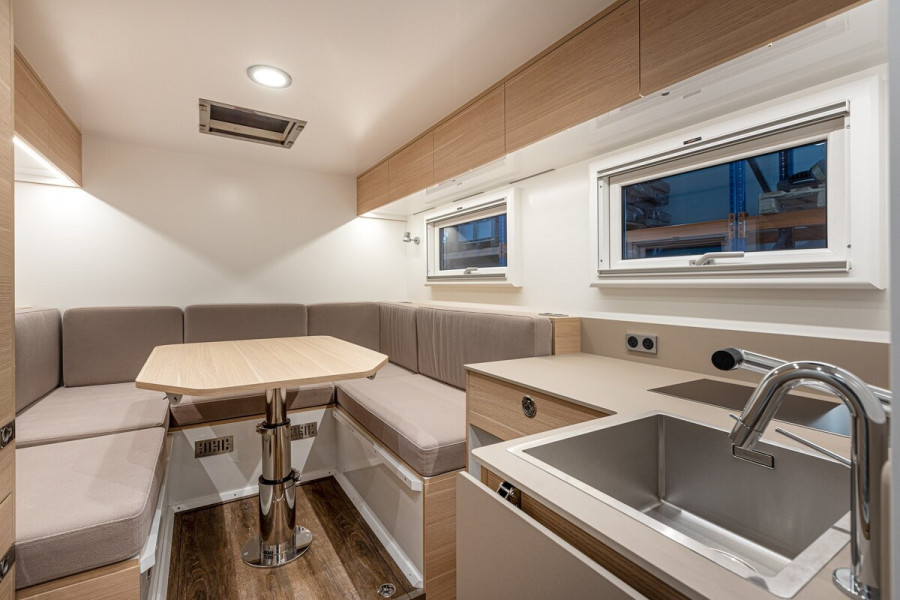 Στο εσωτερικό του, το Bedrock προσφέρει ένα τεράστιο king size κρεβάτι, κουζίνα, πλήρες μπάνιο και δυνατότητα μετατροπής της τραπεζαρίας σε χώρο ύπνου. Διαθέτει σύστημα General Ecology Seagull IV-X2, που φιλτράρει και επεξεργάζεται με UV το νερό, εξασφαλίζοντας πόσιμο νερό για τους επιβάτες.