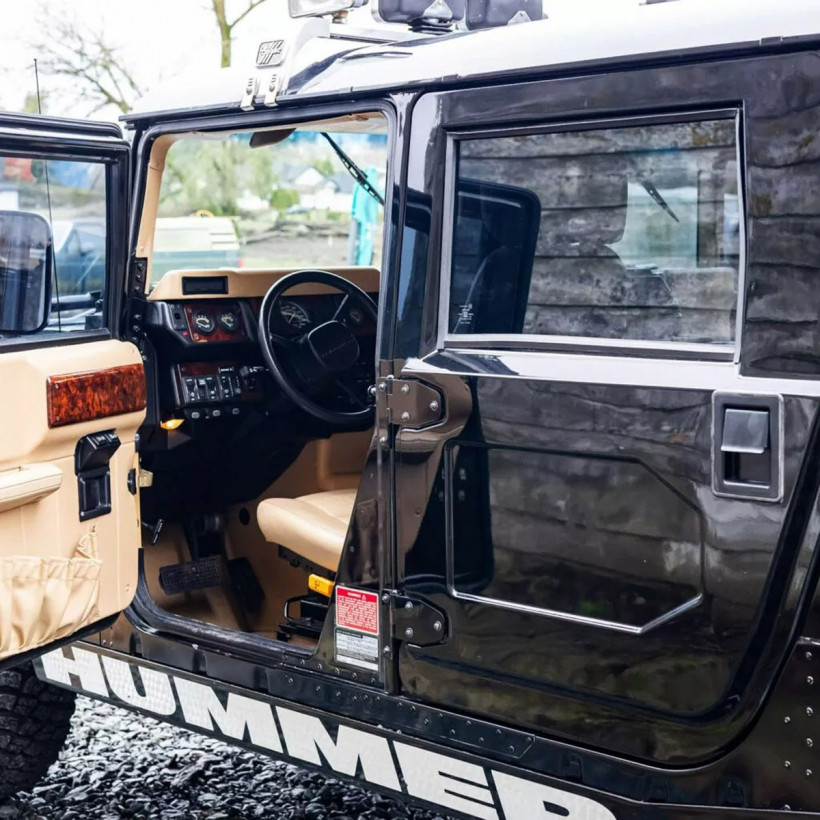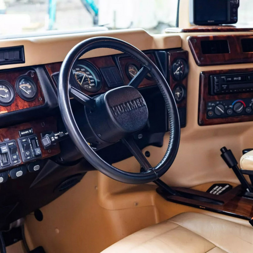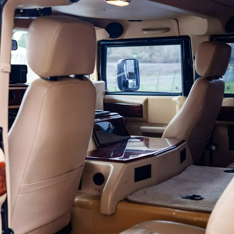 Με μόλις 16.000 χιλιόμετρα στο οδόμετρο, το H1 φέρει τον εντυπωσιακό συνδυασμό μπεζ δερμάτινου σαλονιού με ξύλινες επενδύσεις, οροφής με προβολείς και ηλεκτρικού «εργάτη» μπροστά.