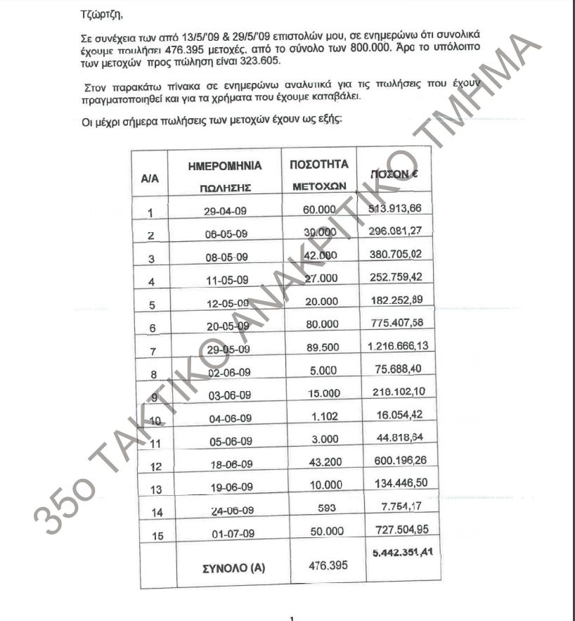 Από την ίδια αλληλογραφία προκύπτει πως μέχρι το Μάιο 2009, με εντολή Τζώρτζη Κουτσολιούτσου η Εμμανουέλα Βασιλάκη είχε πωλήσει μετοχές αξίας 1,625 εκατ. ευρώ, είχε δώσει μετρητά 500.000 ευρώ στην οικογένεια Κουτσολιούτσου και μετά την αφαίρεση της διαφοράς των τόκων οφείλε 1,11 εκατ. ευρώ. Στις αρχές Ιουλίου 2009 η ιδία έστειλε και άλλη επιστολή προς τον Τζώρτζη Κουτσολιούτσο, από την οποία προκύπτει πως είχε προβεί στην πώληση 476.395 μετοχών από τις συνολικά 806.451 μετοχές και απόμεναν άλλες 323.605 μετοχές.