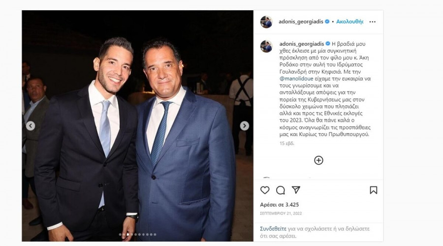 Ωστόσο, η δήλωση αυτή δεν συνάδει π.χ. με τα social media του Άδωνι Γεωργιάδη, στα οποία ο υπουργός Ανάπτυξης αναφέρεται με εκφράσεις αβροφροσύνης στον κ. Ροδάκο και στις σχέσεις τους. Μάλιστα, το γεγονός ότι ο κ. Ροδάκος διοργανώνει φιλικές βραδιές με προσκεκλημένο τον υπουργό Ανάπτυξης θα μπορούσε να παραπέμπει σε «πολιτική ταύτιση» παρά τις εντυπώσεις περί του αντιθέτου.