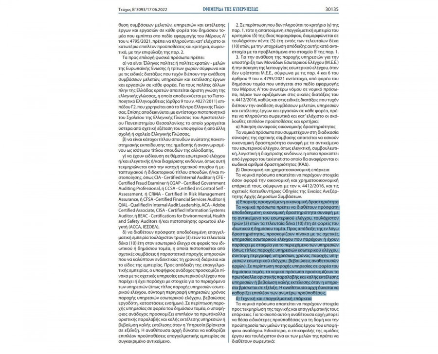 Η σχετική υπουργική απόφαση αναφέρει τα εξής: «Τα νομικά πρόσωπα πρέπει να διαθέτουν πρόσφατη αποδεδειγμένη οικονομική δραστηριότητα συναφή με το αντικείμενο του εσωτερικού ελέγχου, τουλάχιστον τριών (3) ετών τα τελευταία δέκα (10) έτη σε φορείς του ιδιωτικού ή δημόσιου τομέα. Προς απόδειξη της εν λόγω δραστηριότητας, προσκομίζουν πίνακα με τις σχετικές υπηρεσίες εσωτερικού ελέγχου που παρέχουν ή έχουν παράσχει με στοιχεία για το περιεχόμενο των υπηρεσιών (όπως τίτλος παροχής υπηρεσιών εσωτερικού ελέγχου, σύντομη περιγραφή υπηρεσιών, χρόνος παροχής υπηρεσιών εσωτερικού ελέγχου, βεβαιώσεις αναθετουσών αρχών)».