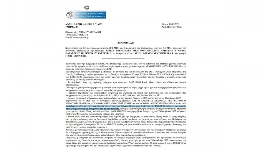 Στη βάση αυτή, στις 19 Μαρτίου 2021 η νεοϊδρυθείσα κυπριακή εταιρεία Clavenia Limited με έδρα τη Λευκωσία, η οποία ανήκει στην κυπριακή εταιρεία Brithin Limited, σύστησε στην Ελλάδα τη «Λάρισα Θερμοηλεκτρική Μονοπρόσωπη Ανώνυμη Εταιρεία Παραγωγής Ηλεκτρικής Ενέργειας».