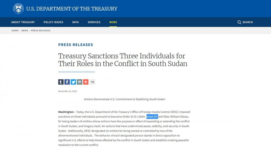 Η κίνηση αυτή της OFAC κρίθηκε επιβεβλημένη καθώς οι ενέργειες του Ισραήλ Ζιβ κρίθηκε πως έρχονταν «σε ευθεία αντίθεση με τις σημαντικές προσπάθειες των ΗΠΑ να βοηθήσουν όσους επλήγησαν από τη σύγκρουση στο Νότιο Σουδάν και να δημιουργήσουν μια διαρκή ειρηνική επίλυση της τρέχουσας σύγκρουσης».