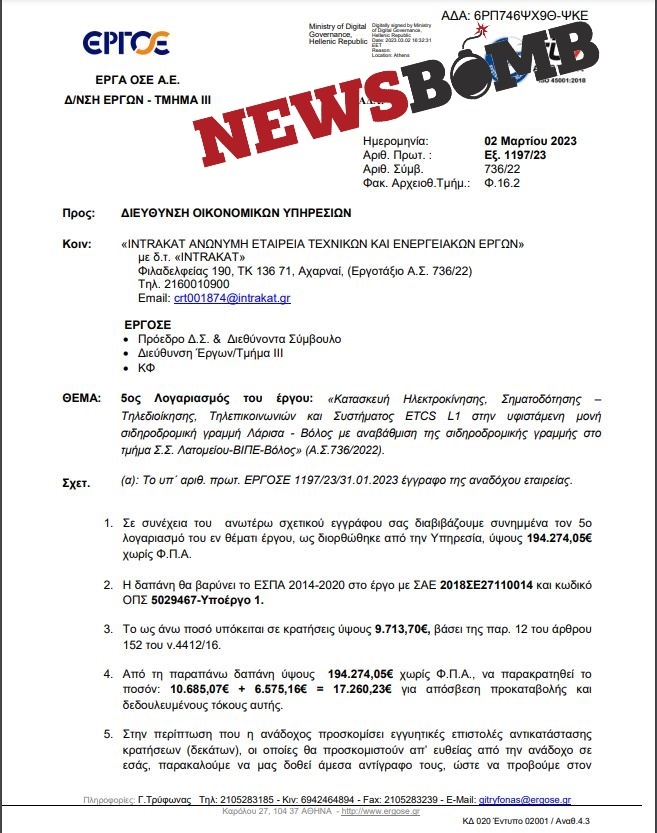 Όπως αναγράφεται σε αποκαλυπτικό έγγραφο το οποίο δημοσιεύουμε σήμερα, δύο ημέρες μετά την τραγωδία οι Διεύθυνση Οικονομικών του Οργανισμού κοινοποίησε σε εταιρεία αλλά και στη Διοίκηση της ΕΡΓΟΣΕ δαπάνη για το έργο: «Κατασκευή Ηλεκτροκίνησης, Σηματοδότησης – Τηλεδιοίκησης, Τηλεπικοινωνιών και Συστήματος ETCS L1 στην υφιστάμενη μονή σιδηροδρομική γραμμή Λάρισα - Βόλος με αναβάθμιση της σιδηροδρομικής γραμμής στο τμήμα Σ.Σ. Λατομείου-ΒΙΠΕ-Βόλος».