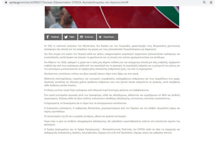 Σε χθεσινή του ανακοίνωση, με την οποία καλούσε στις συγκεντρώσεις υπέρ των μεταναστών, που έγινε χθες σε Αθήνα και Θεσσαλονίκη, το Τμήμα Δικαιωμάτων του κόμματος της αξιωματικής αντιπολίτευσης σημειώνει, μεταξύ άλλων, ότι «η είδηση για έναν νεκρό Σύρο πρόσφυγα από ελληνικά πυρά δυστυχώς φαίνεται να επιβεβαιώνεται». Παράλληλα, κατηγορεί την κυβέρνηση Μητσοτάκη ότι «χειροκροτούμενη από τον Όρμπαν και τον Σαλβίνι πριμοδοτεί μέρες και νύχτες κρυστάλλων».
