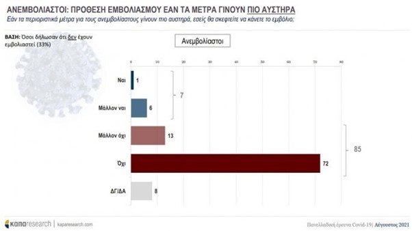 Πάμε τώρα στο επόμενο ερώτημα από το οποίο εξάγονται συμπεράσματα: «Εάν τα περιοριστικά μέτρα για τους ανεμβολίαστους γίνουν πιο αυστηρά, εσείς θα σκεφτείτε να κάνετε το εμβόλιο;» απαντούν ότι δεν θα εμβολιάζονταν ούτε σε αυτή την περίπτωση.