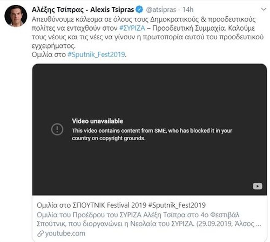Πλέον η ομιλία βρίσκεται κανονικά στην προσωπική σελίδα του Αλέξη Τσίπρα, καθώς, προφανώς, οι ιθύνοντες προέβησαν αργότερα στις… απαραίτητες ενέργειες.