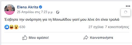 Στη συνέχεια η δημοσιογράφος ενημέρωσε πάλι με ανάρτησή της στο Facebook ότι έσβησε την ανάρτηση για την Μανωλίδου για ήταν τρολιά.