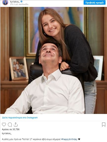 Χρόνια πολλά στην κόρη του Δάφνη ευχήθηκε ο πρωθυπουργός Κυριάκος Μητσοτάκης με ανάρτησή του στον προσωπικό του λογαριασμό στο Instagram.