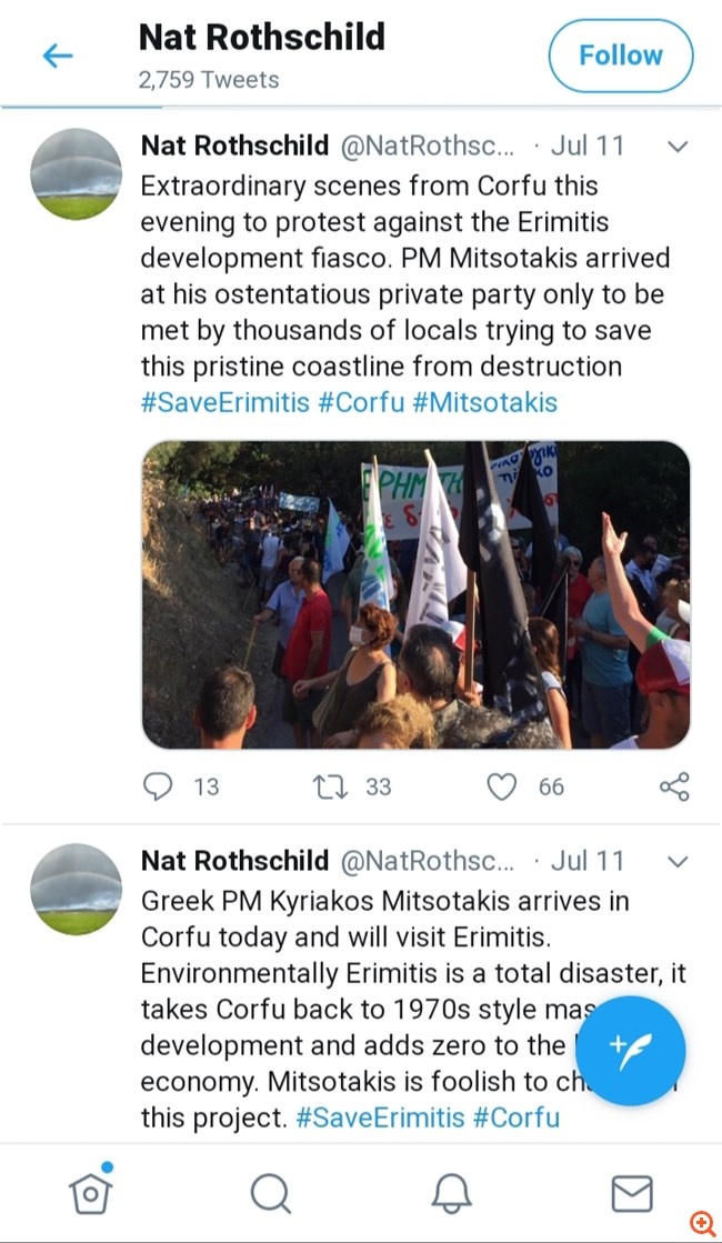 Με αφορμή την προ ημερών επίσκεψη του Κυριάκου Μητσοτάκη στην Κέρκυρα, ο Νατ Ρότσιλντ με δύο αναρτήσεις που φέρονται να έγιναν από τον προσωπικό του λογαριασμό στο Twitter χαρακτηρίζει «ανόητο» (foolish) τον Έλληνα Πρωθυπουργό «που προασπίζεται αυτό το έργο» και «φιάσκο» την άνω των 120 εκατ. ευρώ επένδυση στην περιοχή Ερημίτης στην Β.Α. Κέρκυρα.