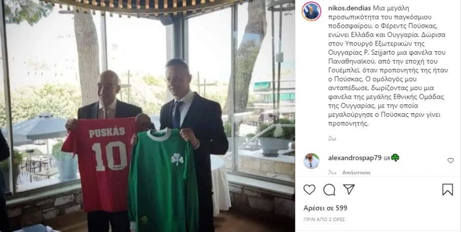 Ο Νίκος Δένδιας προσέφερε στον ομόλογο του μια φανέλα του Παναθηναϊκού από την ομάδα του «Γουέμπλεϊ», στην οποία ήταν προπονητής ο Πούσκας και ο Ούγγρος υπουργός Εξωτερικών μια φανέλα της εθνικής Ουγγαρίας, με τυπωμένο το όνομα του «Πάντσο».