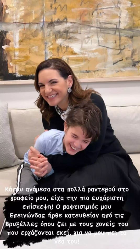 «Κάπου ανάμεσα στα πολλά ραντεβού στο γραφείο μου, είχα την πιο ευχάριστη επίσκεψη! Ο βαφτισιμιός μου, ο Επαμεινώνδας ήρθε κατευθείαν από τις Βρυξέλλες όπου ζει με τους γονείς του, που εργάζονται εκεί για να μου πει τα νέα του», έγραψε η Όλγα Κεφαλογιάννη.