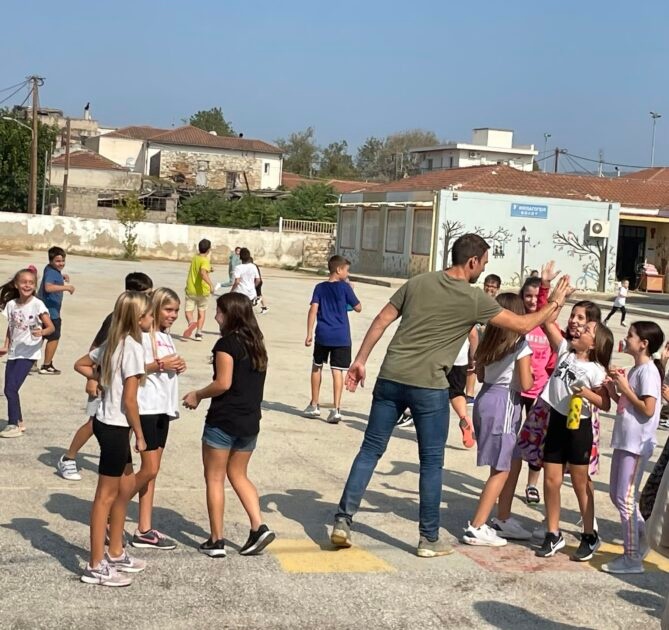 Ο Στέφανος Κασσελάκης χαιρέτησε και έπαιξε με τους μαθητές, ενώ στη συνέχεια ενημερώθηκε για τα προβλήματα των κατοίκων της περιοχής.