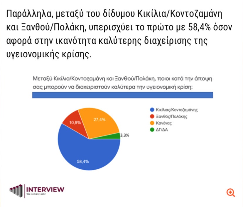 Μεγάλη η διαφορά μεταξύ του δίδυμου Κικίλια/Κοντοζαμάνη και Ξανθού/Πολάκη, όσον αφορά στην ικανότητα καλύτερης διαχείρισης της υγειονομικής κρίσης, αποτυπώνεται σε έρευνα της interview, σύμφωνα με την οποία το δίδυμο που κατοικοεδρεύει τώρα στην οδό Αριστοτέλους υπερισχύει των πρώην υπουργών του ΣΥΡΙΖΑ με 58,4% έναντι 10.9%.