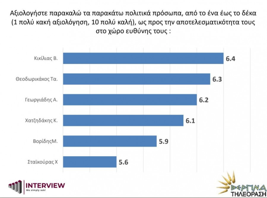 Νέα πανελλαδική δημοσκόπηση πραγματοποίησε η εταιρία Interview για λογαριασμό της Βεργίνα Tv. - Ο Κικίλιας εμφανίζεται πρώτος σε αποτελεσματικότητα μεταξύ των υπουργών της ΝΔ