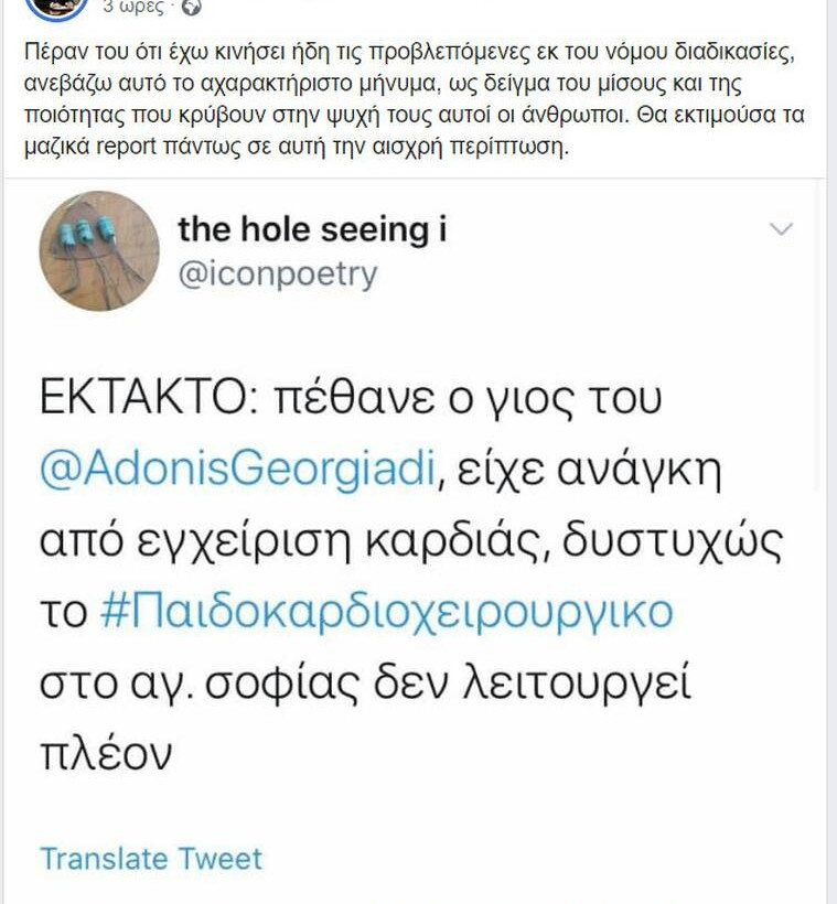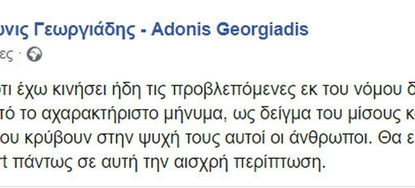 Η ανάρτηση του Άδωνι Γεωργιάδη έχει ως εξής: «Πέραν του ότι έχω κινήσει ήδη τις προβλεπόμενες εκ του νόμου διαδικασίες, ανεβάζω αυτό το αχαρακτήριστο μήνυμα, ως δείγμα του μίσους και της ποιότητας που κρύβουν στην ψυχή τους αυτοί οι άνθρωποι. Θα εκτιμούσα τα μαζικά report πάντως σε αυτή την αισχρή περίπτωση».