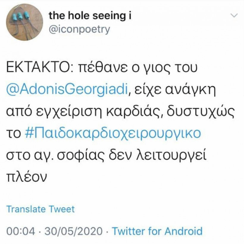 Ένας λογαριασμός στο Twitter «ενημέρωνε» το κοινό πως ο γιος του υπουργού Ανάπτυξης έφυγε από τη ζωή γιατί είχε ανάγκη από εγχείρηση καρδιάς η οποία δεν μπορούσε να πραγματοποιηθεί γιατί το «παιδοκαρδιοχειρουργικό του νοσοκομείου Αγία Σοφία δεν λειτουργεί πλέον».